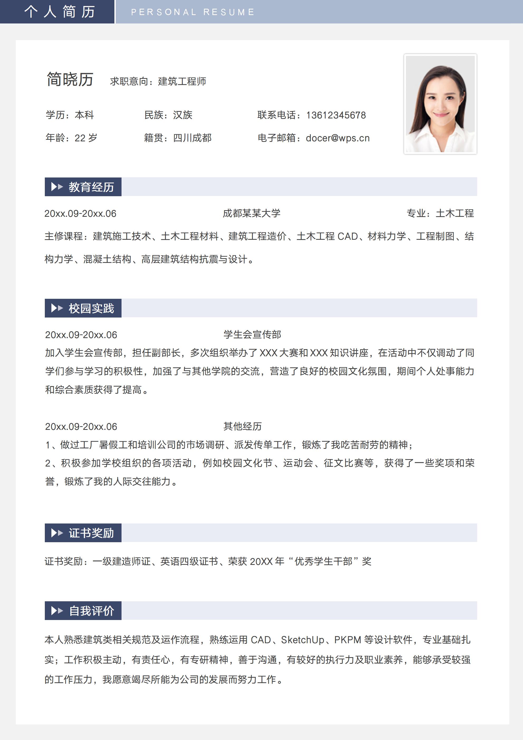 068-无经验建筑工程师应届生实习简历